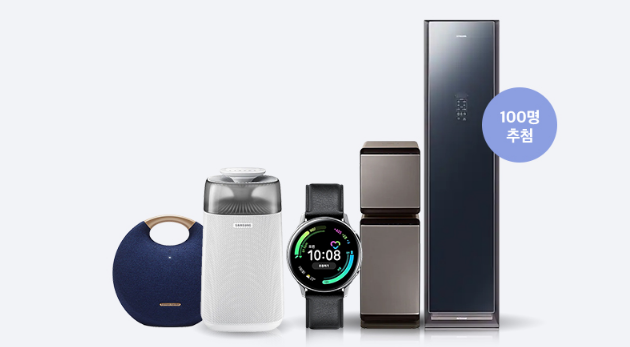 - Klug 미니 마사지기 SE, 삼성 JBL 무선이어폰 FreeX, LUNE 무선충전 블루투스 스피커, OA퓨어 공기청정기, ReQM 짐벌 셀카스틱, RAON 무드등 무선충전기 중 선택 1