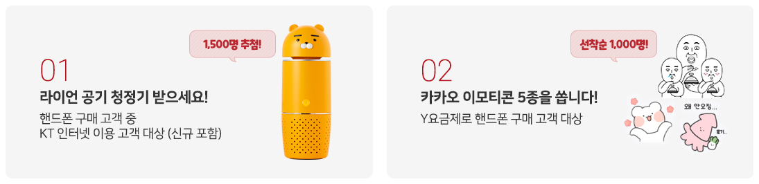 - 2월 29일까지 개통 완료한 고객 중 KT 인터넷 이용 고객 대상 1500명 추첨으로 라이언 공기청정기, Y요금제로 구매 고객 대상 선착순 1000명에게 카카오 이모티콘 5종 지급