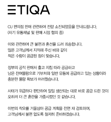 신민아 마스크, 김다미 마스크, 조이서 마스크, 이태원클라쓰 마스크 등으로 유명한 마스크 전문 브랜드 에티카 에서 3월4일부터 CU편의점을 통해 마스크 판매를 진행했지만, 전량 소진되었고 현재 차기 유통채널 및 판매시점을 협의중입니다. 편의점 마스크 판매가 활발해지면 좋을텐데 말이죠. 그래서 정부에서 편의점을 공적마스크 판매처에 포함하는 방안을 검토중이라서 조만간 편의점에서도 공적 마스크를 구매할 수 있기를 기대해봐도 좋을 것 같습니다. 추후에 편의점 마스크 판매와 함께 우체국쇼핑, 농협몰 등 마스크 온라인 판매가 시작된다면 구매하기가 한결 쉬워질 것 같습니다.