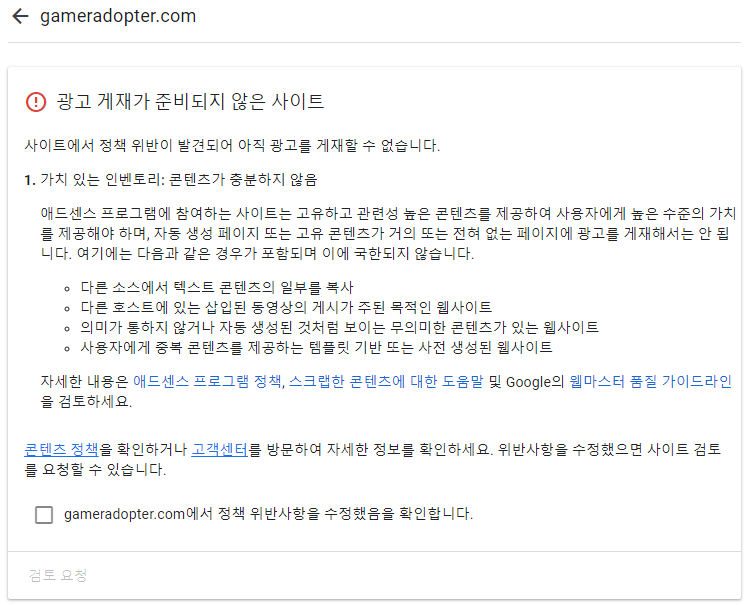 도메인 변경하고 가장 큰 문제점은 애드센스를 다시 승인받아야합니다. 흔히들 애드고시라고 하는 과정을 다시 해야합니다. 저는 도메인을 바꾸면 바꾼 도메인으로 사이트 추가를 통해 애드센스 재승인을 받아야한다는 점은 이미 알고있었고, 기존에 200개 가까운 글들이 있었고 빈약한 글도 많지만 정성스러운 글들도 있었기에 몇일기다리면 바로 승인이 날줄 알고 큰 걱정 안했습니다. 하지만 이부분이 제가 가장 간과(?)했던 문제였습니다. 계속해서 컨텐츠 불충분으로 애드센스 승인이 탈락되고 있습니다. 제 예상으로는 기존에 썼던 글들로 심사를 하는게 아닌, 변경된 도메인으로 새롭게 작성된 글들로 다시 심사를 하는 것 같습니다. 어쩌면 기존 주소로 작성된 글들을 무단 복제해서 작성된 글들로 인식하는 건 아닐까 싶기도 하구요.(구글 입장에서는 제가 도메인 변경한걸 모르니 기존 도메인과 새로운 도메인은 각각 별개의 사이트로 인식할테니 말이죠.) 그래서 제 글들은 현재 애드센스 광고가 노출되지 않습니다. 혹시나 싶어 탈락 메일을 받고 바로 다시 재승인 요청을 해봤지만 계속해서 몇일 뒤 컨텐츠부족으로 탈락하고 있습니다. 현재 목표는 8월안에 변경된 도메인으로 다시 승인을 받고 9월부터 다시 포스팅에만 집중하고 싶습니다.