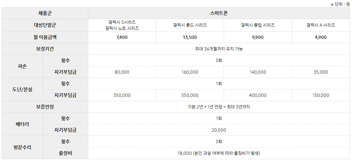 먼저 가장 많이 사용하시는 스마트폰 종류는 플래그십 모델 갤럭시S 시리즈와 갤럭시 노트 시리즈는 월 7400원, 폴더블폰인 갤럭시 폴드 시리즈는 13500원, 갤럭시 Z플립 시리즈는 월 9900원이며 보급형인 갤럭시 A시리즈는 월 4900원에 가입이 가능합니다. 최대 36개월까지 보장기간 유지가 가능하고 스마트폰의 경우 기본 보장 내역이 기본 보증 2년, 배터리 보증1년인데 삼성케어플러스에 가입하면 여기에 추가로 파손 3회 보장, 도난 및 분실 1회 보장, 배터리 1회 보장, 보증 1년 연장, 방문 수리 최대 3회의 추가 보장 혜택을 받을 수 있습니다.