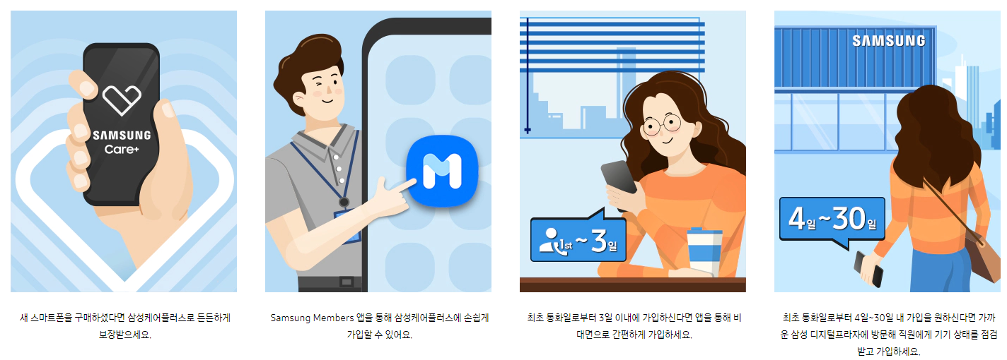 삼성케어플러스 가입 방법은 삼성 스마트폰을 구매하고 최초 통화일로부터 3일 이내일 경우에는 삼성멤버스앱(Samsung Members)을 통해 비대면으로 가입할 수 있고, 최초 통화일로부터 4일 이후라면 가까운 삼성 디지털프라자에 방문한다음 직원에게 기기 상태를 점검한 뒤에 가입이 가능합니다. 갤럭시탭이나 갤럭시 버즈, 갤럭시 워치의 경우에는 구매일로부터 30일 이내에 가입이 가능합니다.