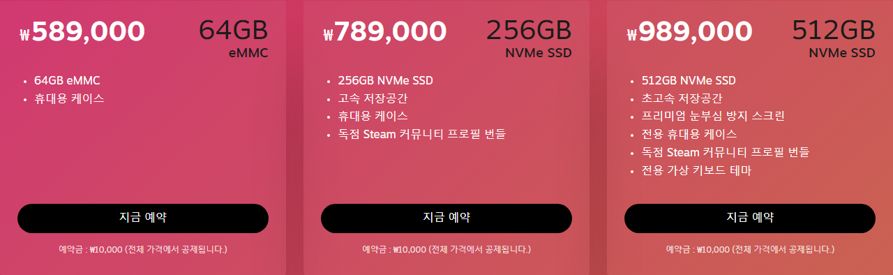 한국에 출시되는 스팀덱도 해외판처럼 3가지 종류로 출시합니다. 먼저 64GB eMMC, 휴대용 케이스만 포함된 가장 낮은 가격인 589,000원 모델, 다음으로 256GB NVMe SSD를 탑재해 더욱 빠른 저장공간과 휴대용 케이스, 독점 Steam 커뮤니티 프로필 번들이 포함된 789,000원 모델, 마지막으로 512GB NVMe SSD를 탑재하고 프리미엄 눈부심 방지 스크린과 전용 휴대용 케이스, 독점 스팀 커뮤니티 프로필 번들과 전용 가상 키보드 테마까지 포함된 끝판왕급 989,000원 모델이 있습니다.