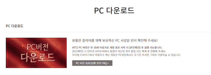 히트2 PC버전 다운로드 이미지를 클릭해 히트2 PC버전 런처를 다운받아 실행해주세요. 참고로 히트2 PC 버전은 18세 이용가이므로 게임 최초 실행시에 본인인증을 완료해야 정상적으로 플레이할 수 있습니다.