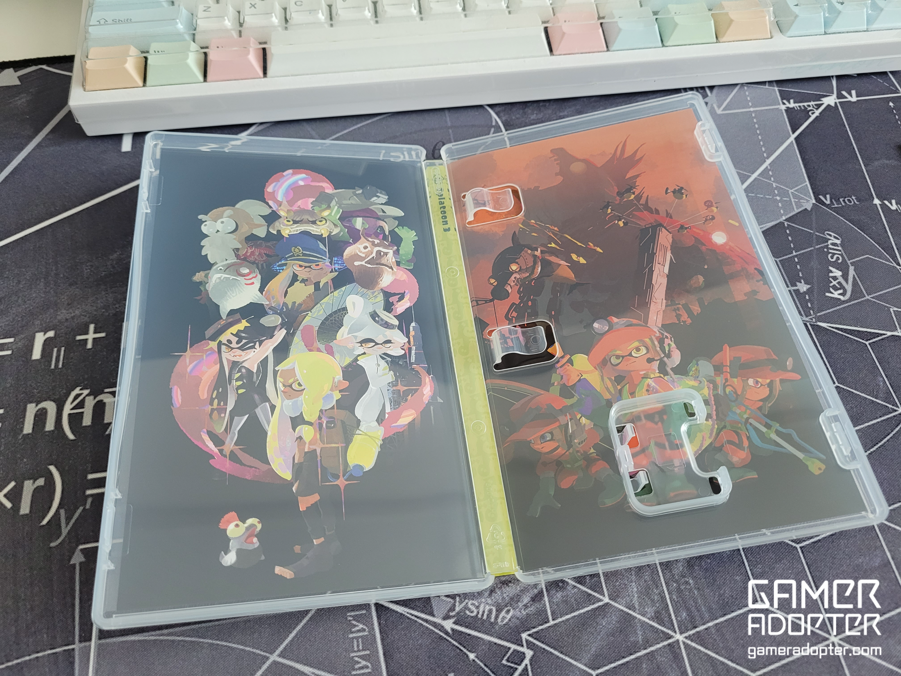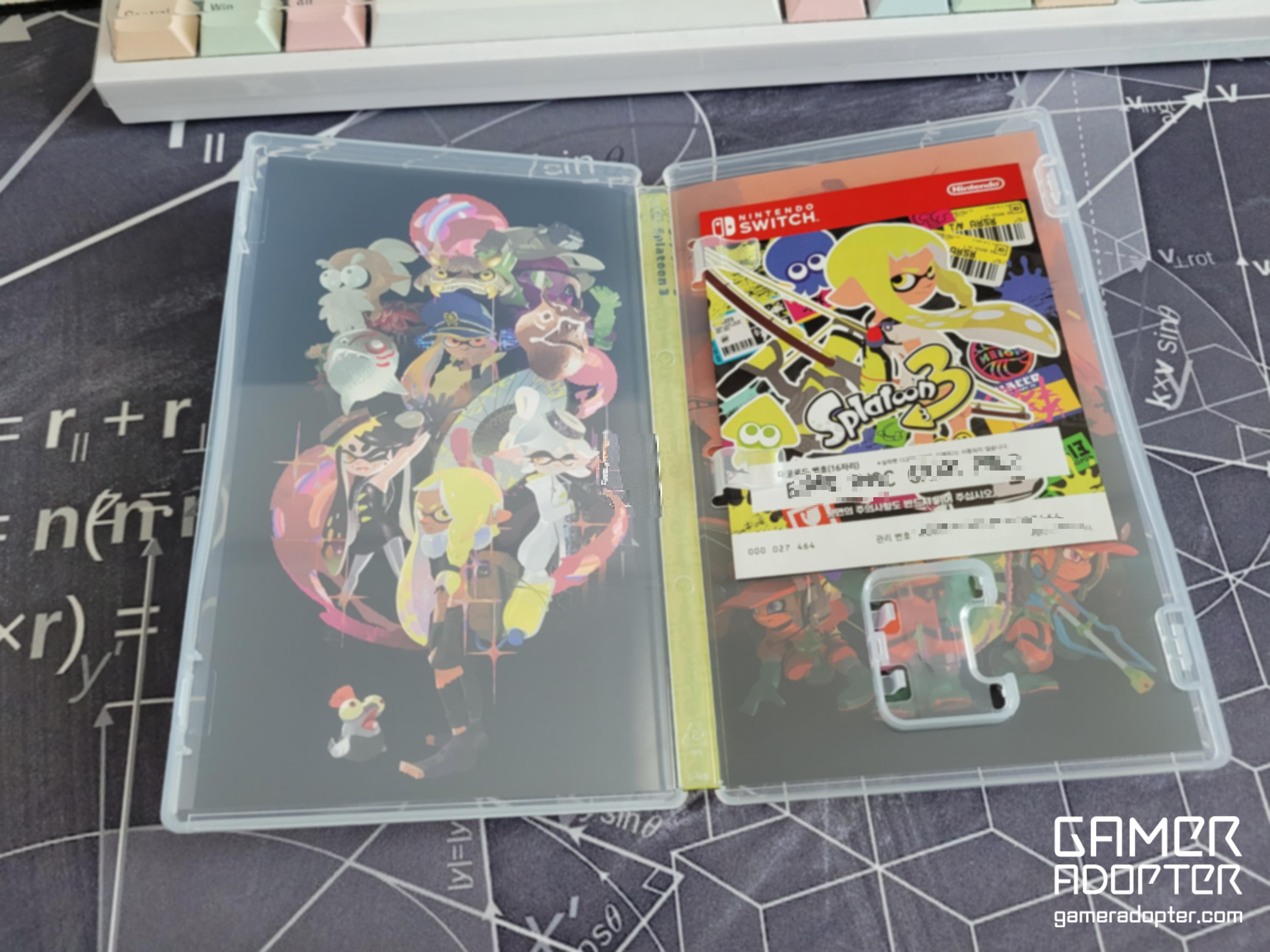 스플래툰3 패키지 내부 모습입니다. 게임칩이 들어있어야 할 공간은 비어있고, 대신 다운로드 코드가 포함된 종이가 한장 끼워져있습니다. 내부 속지도 이쁘게 잘 되어있습니다. 예전에 피파22 구매했을 땐 내부 속지가 그냥 흰색으로 아무것도 없어서 너무 아쉬웠는데 스플래툰3는 내부 속지도 잘 꾸며져있고 소장용으로 매우 마음에 듭니다.