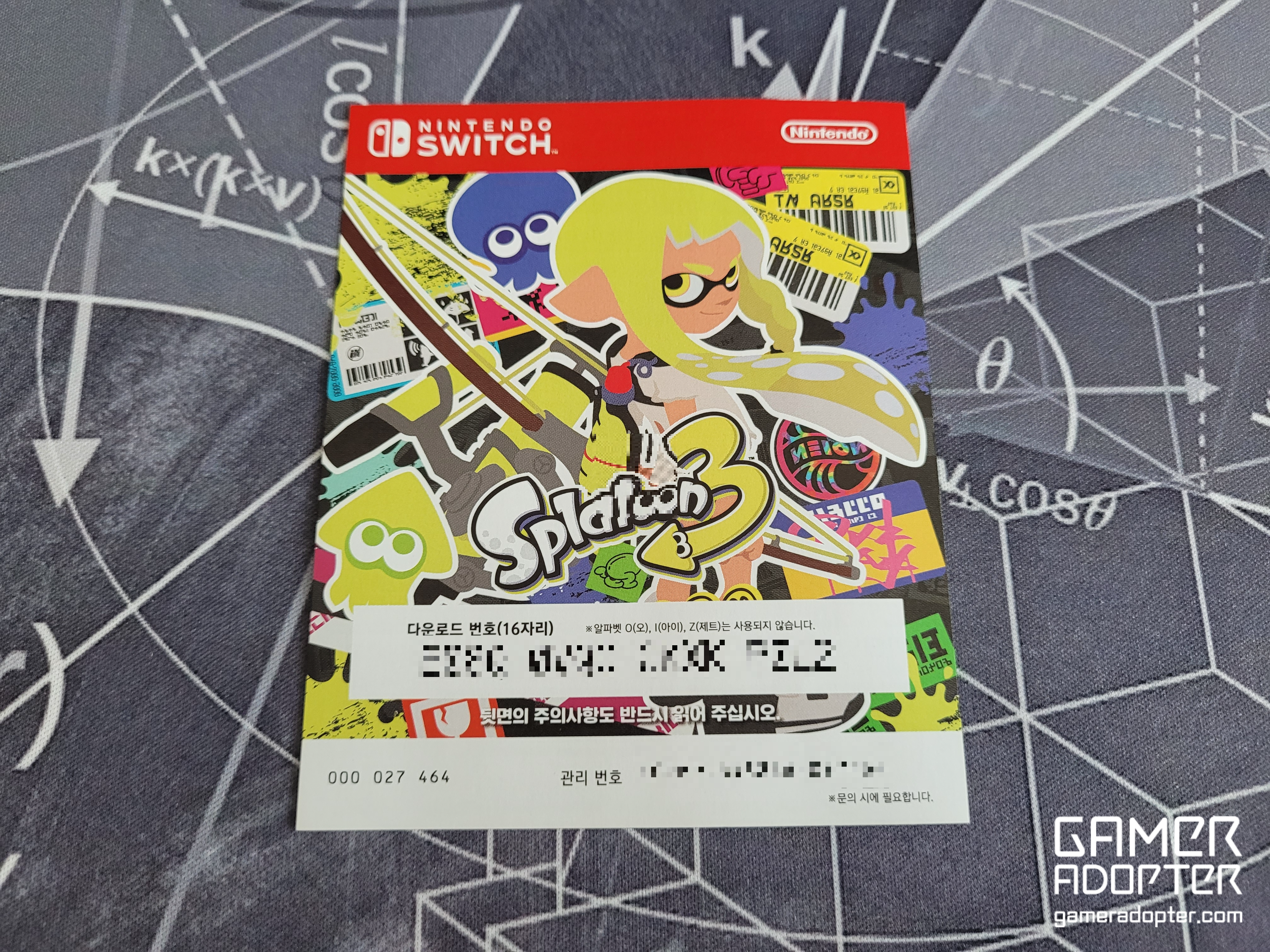 동봉된 스플래툰3 다운로드 코드를 살펴보면 앞면에 e숍에서 다운받을 때 사용하는 다운로드 번호 16자리가 나와있고, 뒷면엔 다운로드 방법이 안내되어 있습니다. 당연히 다운로드 코드는 한 번 사용하면 재사용이 불가능한 1회용 코드입니다. 스플래툰3를 다운로드 받기 위해서는 18세 이상의 닌텐도 어카운트와 6GB이상의 저장공간이 필요합니다.