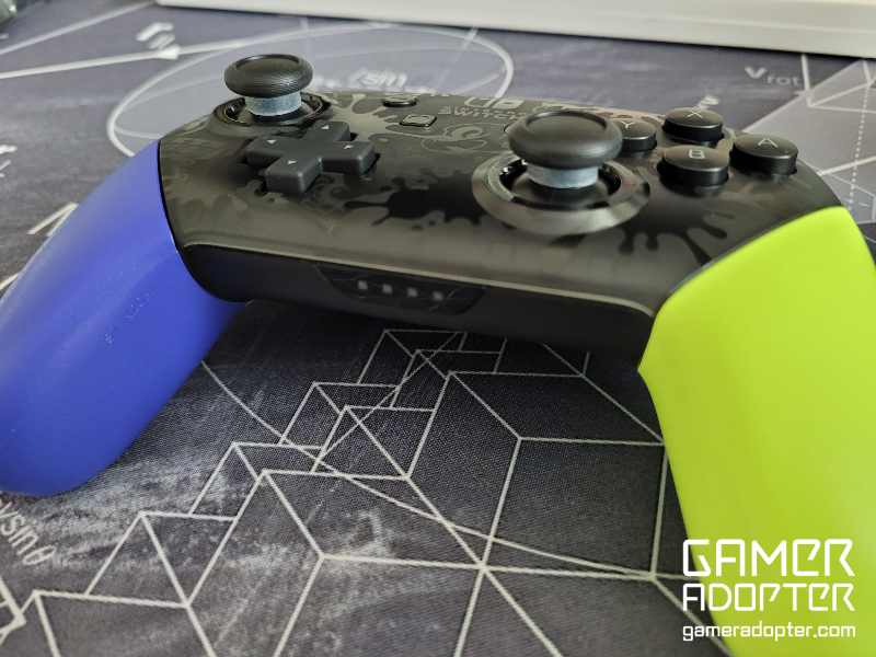 프로콘 상단 부분과 뒷면의 모습입니다. 뒷면에도 스플래툰 그래픽이 입혀져있고 상단부분엔 스크래치 방지 필름이 붙어있는데 필름이 붙어있어도 C타입 케이블 연결이나 페어링 버튼이 눌러져서 자연적으로 떨어질때까지 붙여놓고 쓰려고합니다. 바로 떼어버리자니 왠지 모르게 너무 아까워서요.