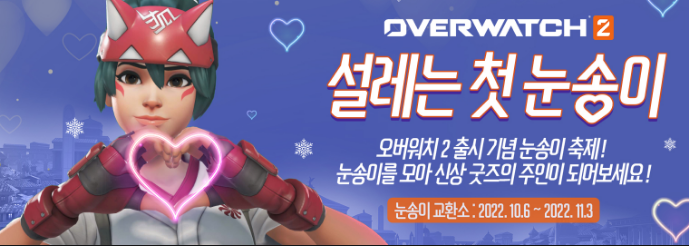 오버워치2 출시 기념 눈송이 교환소 이벤트가 10월6일부터 11월3일까지 진행됩니다. 오버워치2 눈송이 교환소 이벤트는 정해진 기간동안 오버워치2에 접속해 게임을 플레이해서 눈송이를 적립받고 모은 눈송이를 다양한 오버워치2 굿즈 경품에 응모할 수 있는 이벤트 입니다.
