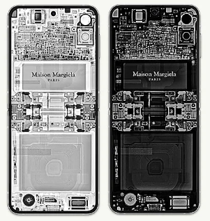 먼저 갤럭시 Z플립4 메종 마르지엘라 에디션의 디자인 특징들을 살펴보면, 메종 마르지엘라 시그니처 컬러인 솔리드 화이트 색상을 베이스로 메종 마르지엘라의 데코르티크 기법에서 영감을 얻은 내부 디자인을 외부로 노출 시킨 듯한 느낌을 살려 Z플립4 실제 내부와 동일한 회로 형상을 후면 디자인에 적용했습니다.