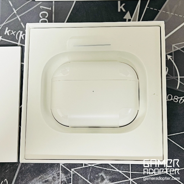 종이쪼가리를 치우니 드디어 영롱한 에어팟프로2 케이스가 보입니다. 사실 지금 이 모습만 봐서는 에어팟프로 1세대와 구분이 안가서 이게 2세대인지 1세대인지 차이점을 느끼기 어렵습니다.