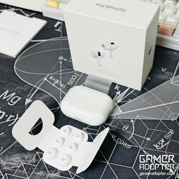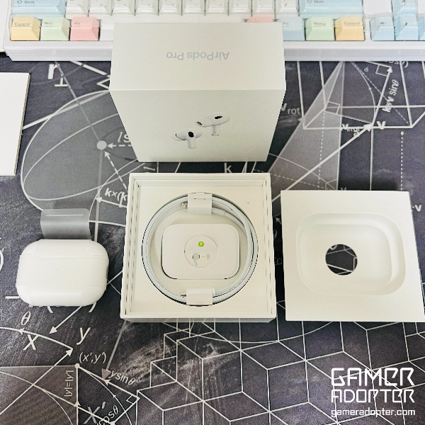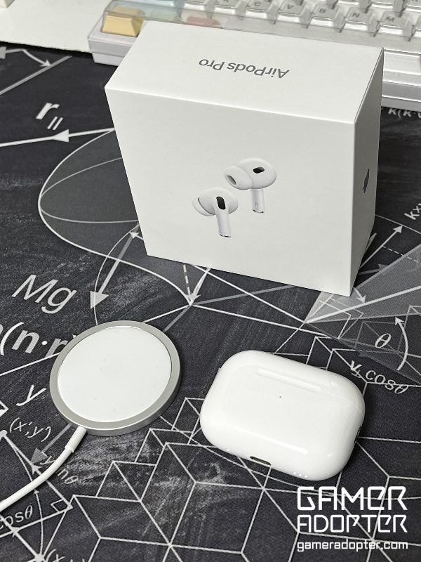 에어팟프로 2세대 구성품을 살펴보겠습니다. 맥세이프 충전이 가능한 충전케이스와 라이트닝 to C타입 케이블, 그리고 다양한 사이즈의 이어팁이 들어있습니다.
