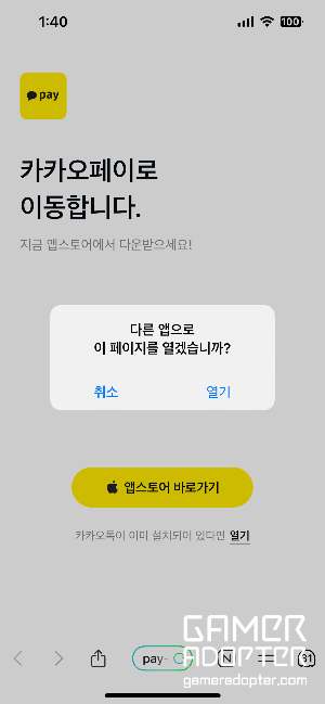 스캔이 완료되면 카카오페이로 이동하는 화면이 나오게됩니다. 다른 앱으로 이 페이지를 열겠습니까? 열기를 선택해주시면 됩니다.
