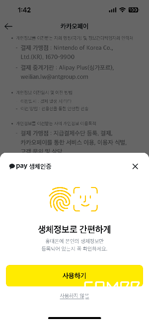동의를 누르면 페이스ID 등 생체 정보를 사용할 지 묻는데 저는 일단 사용하지 않음을 선택했고 결제 비밀번호를 입력해줍니다.