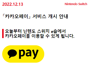 오늘부터 카카오페이를 이용해 e숍에서 DL게임 구매 시 카드 결제가 가능해졌습니다. 다만 e숍 카카오페이 카드 결제는 닌텐도 온라인 스토어에서는 이용이 불가능하고 반드시 닌텐도스위치 본체로 e숍에 접속했을때만 카카오페이로 구매가 가능합니다.