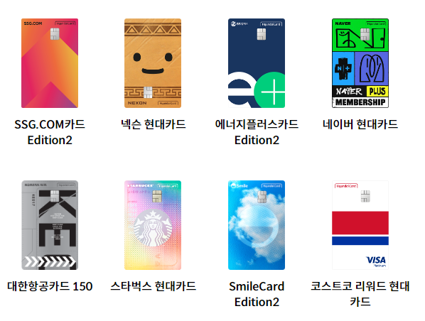 또한 SC제일은행 현대카드나, 스마일카드 현대카드, 네이버 현대카드, 넥슨 현대카드, SSG.COM 현대카드, 스타벅스 현대카드, 코스트코 리워드 현대카드 등 다양한 브랜드와 콜라보한 현대카드 시리즈도 애플페이 등록 및 사용이 가능합니다.