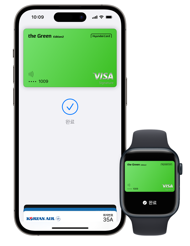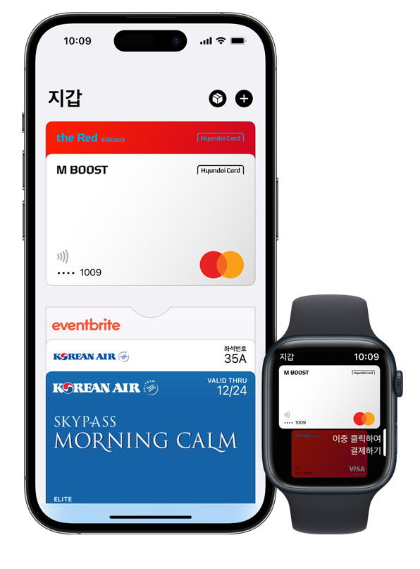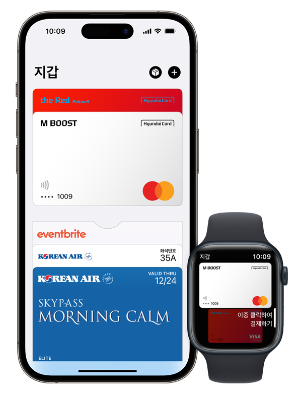 한국에서 애플페이를 사용하려면 현재는 현대카드 계열의 비자, 마스터카드 브랜드의 신용 카드 및 체크카드만 등록이 가능합니다.