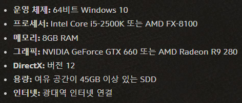기본 해상도 1080P, 그래픽 설정 중간, 60FPS로 실행 할때 필요한 사양 입니다.