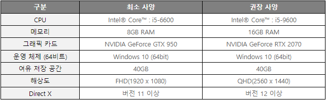 프라시아전기 PC 버전 사양은 위에 보시는 것처럼 40GB정도의 용량을 차지하며 권장 사양에 경우 그래픽카드가 RTX2070이 권장 사양으로 잡혀 있어 모바일게임 PC 버전치고는 꽤나 높은 사양이라고 볼 수 있습니다. 물론 기준이 QHD 해상도 기준이라 그럴수도 있지만 그래픽이 얼마나 좋을지 기대됩니다.