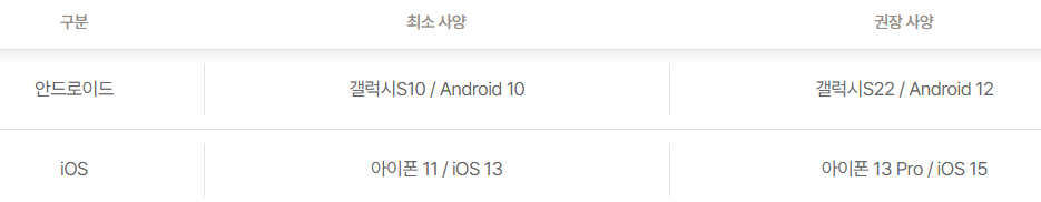 프라시아전기 모바일 사양은 안드로이드의 경우 갤럭시 S22가 권장 사양이며, iOS의 경우 아이폰 13PRO가 권장 사양으로 정해졌습니다. 모바일버전 권장 사양도 굉장히 높게 잡혔다고 볼 수 있겠습니다.
