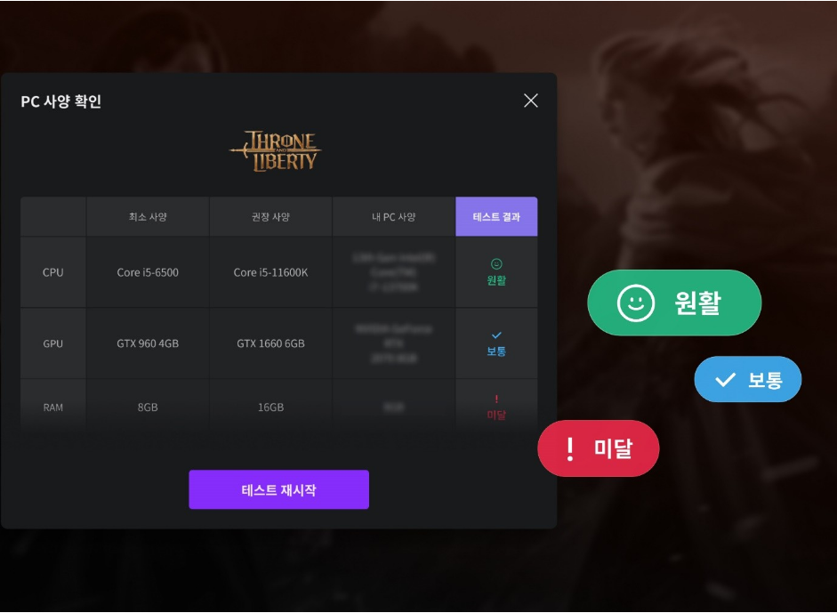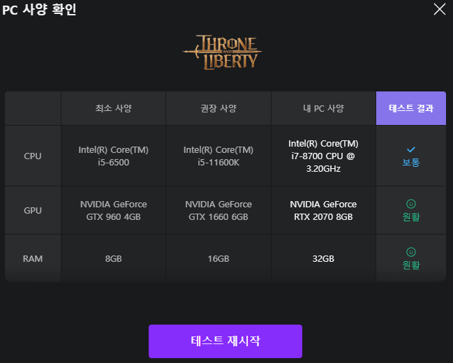 최신 고사양 PC를 사용중이신 분들은 상관 없겠지만 저처럼 애매한 성능의 PC를 가지고 있어서 내 PC에서 쓰론앤리버티를 원활하게 플레이 가능한지 궁금하신 분들은 퍼플에서 쓰론앤리버티 PC 사양 확인 기능을 사용 해 보시기 바랍니다.